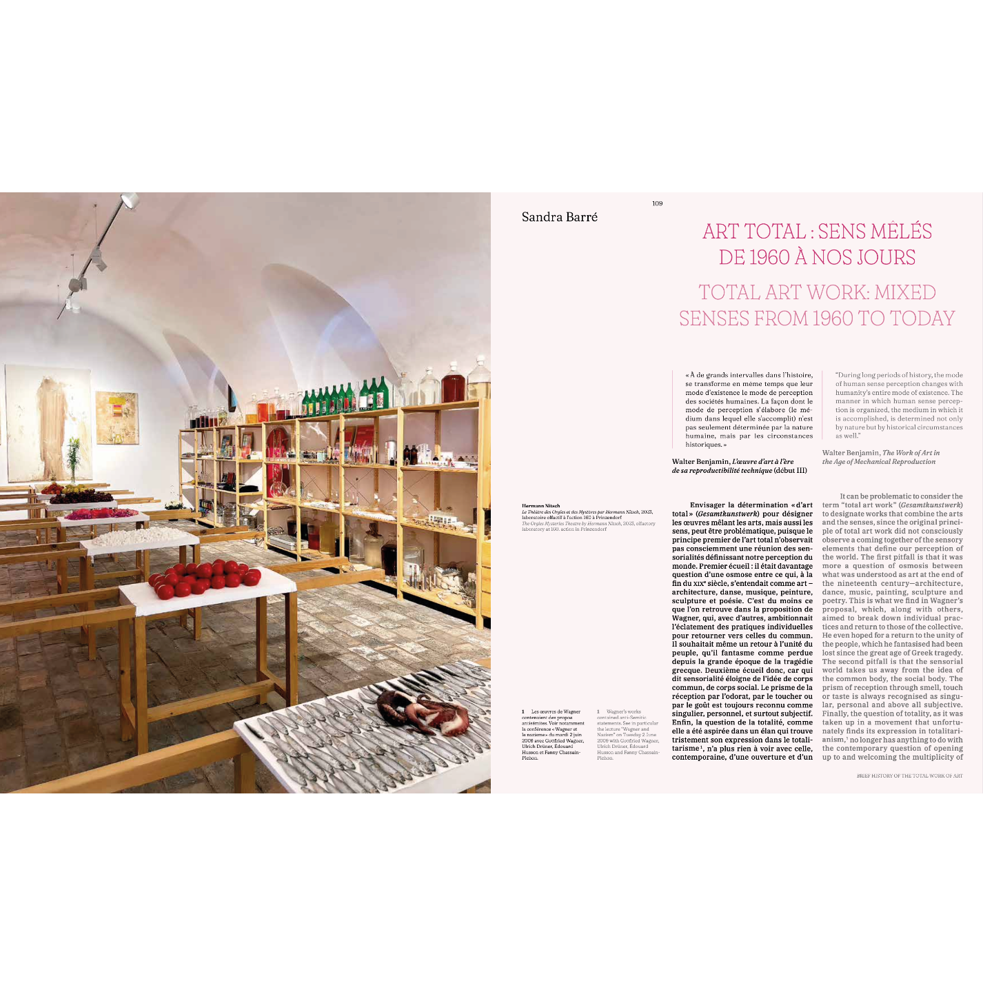 Catalogue d’exposition Musée international de la Parfumerie de Grasse (14 juin 2024 au 12 janvier 2025) L’exposition Mondes Sensibles, une histoire sensorielle de l’art total axe son approche sur les sensorialités dans le concept d’art total. Les recherches olfaction que mène la commissaire d’exposition Sandra Barré l’ont poussée à observer une forme de retour au concept d’art total visant à interpeller l’ensemble du corps dans l’expérience artistique.