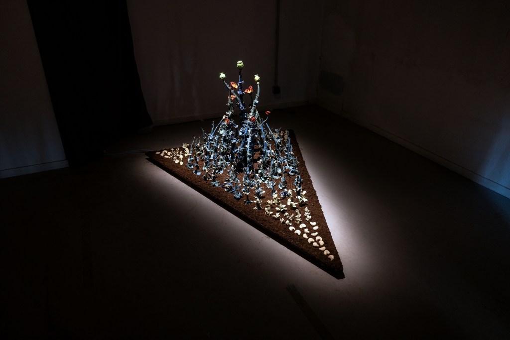 Pour Opiumarium, œuvre lauréate de la seconde édition du Prix Flair, Haonan He présente une installation où céramique, image d’archive et odeurs se côtoient. Un champ de pavot représentant le cycle de vie de la plante de sa graine à sa floraison, fait écho à l’image d’archive du début du XXe siècle qui ouvre l’espace, représentant des enfants chinois en pleine cueillette. L’odeur de la plante diffusée, rappelle le moyen d’inhalation des fumeurs d’opium, drogue obtenue après transformation humaine et qui fût tristement au cœur de manipulations économiques de l’Angleterre envers la Chine et qui plongea nombre de sujets de l’empire dans une violente addiction.